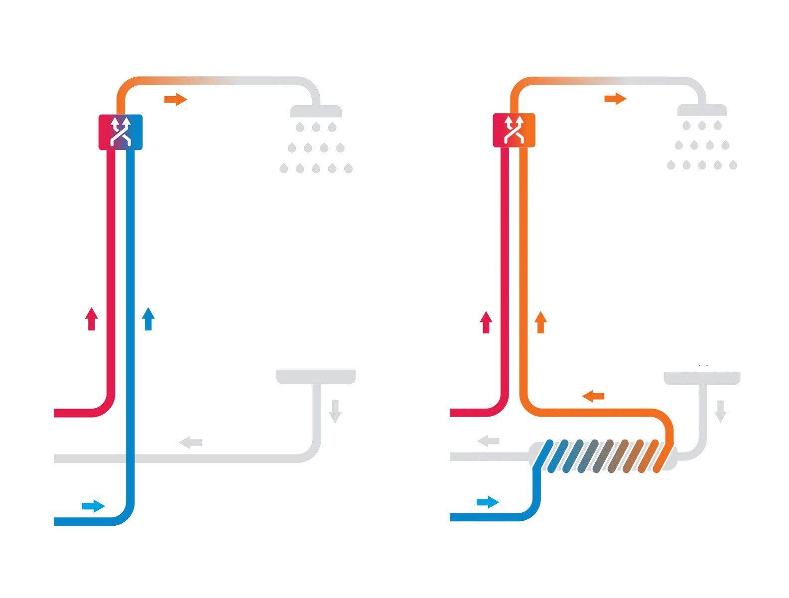 Mechanizm odzyskiwania ciepła opiera się na dogrzewaniu bieżącej zimnej wody za pomocą ciepła pozyskiwanego z odpływającej wody szarej. Odnalezione ciepło jest przekazywane do baterii prysznica lub zbiornika na ciepłą wodę, co znacznie zmniejsza ilość zużywanej ciepłej wody i prowadzi do istotnej redukcji energii potrzebnej do podgrzewania wody. Dzięki odzyskowi ciepła z wody możemy zredukować zużycie energii potrzebnej do podgrzewania wody.